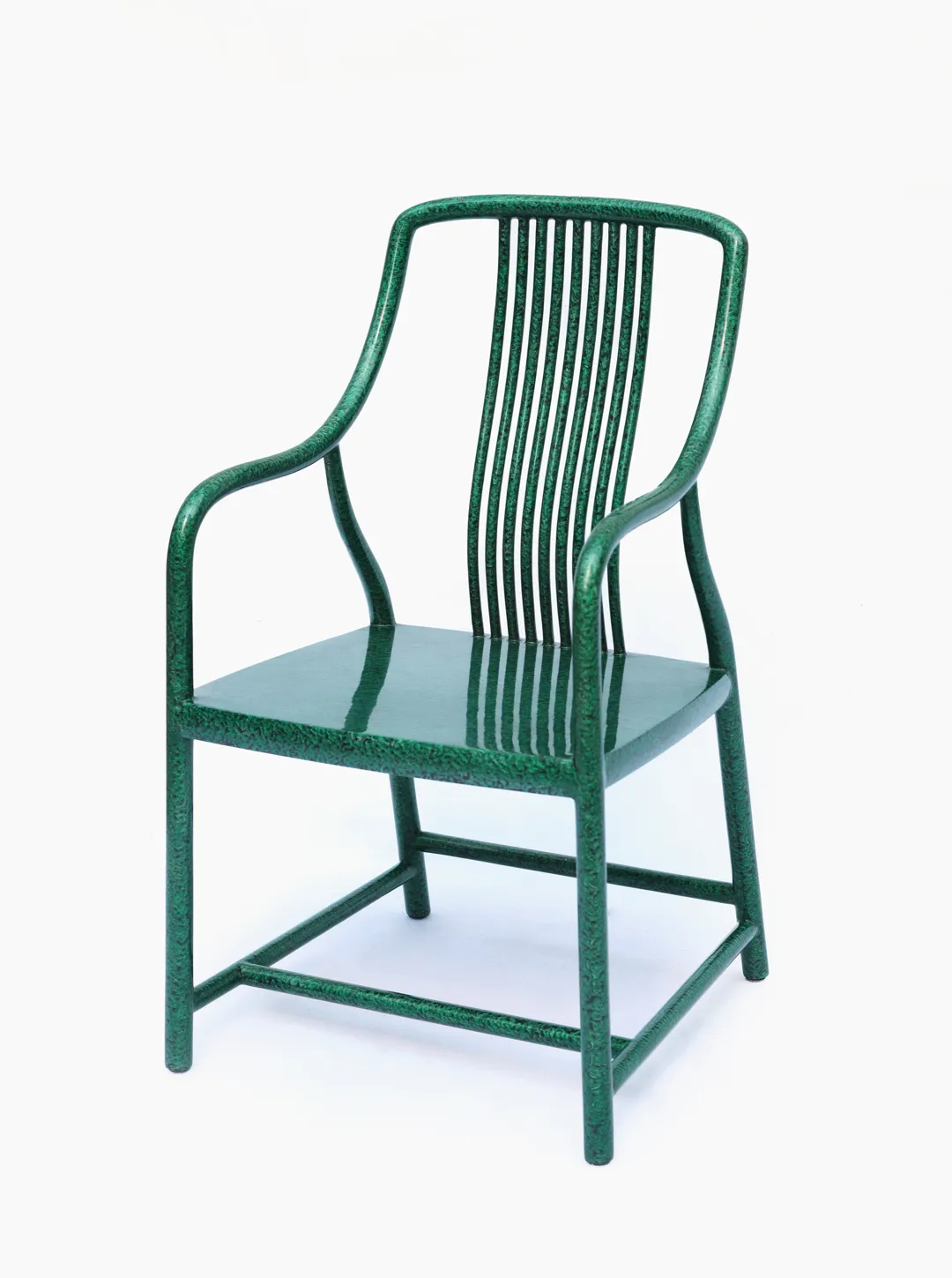 绿色配色如山水庭院,赋予静物动态意境。椅身线条简练承自明式家具,与古典漆艺形成时空对话。此椅兼具实用与艺术价值,既是非遗的当代转译,亦是东方雅致生活的体现,适用于中西多元空间。