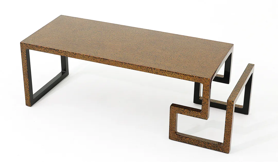 材质上采用木胎为基础,结合传统榫卯结构工艺,坚固耐用,无钉无胶,体现古代家具的匠心工艺。表面以国家级非遗技艺——大漆犀皮漆精心髹饰。犀皮漆工艺通过多层漆面堆积、打磨,形成如兽皮般斑驳细腻的纹理,色泽温润沉稳,散发出深厚的历史感和艺术气息。