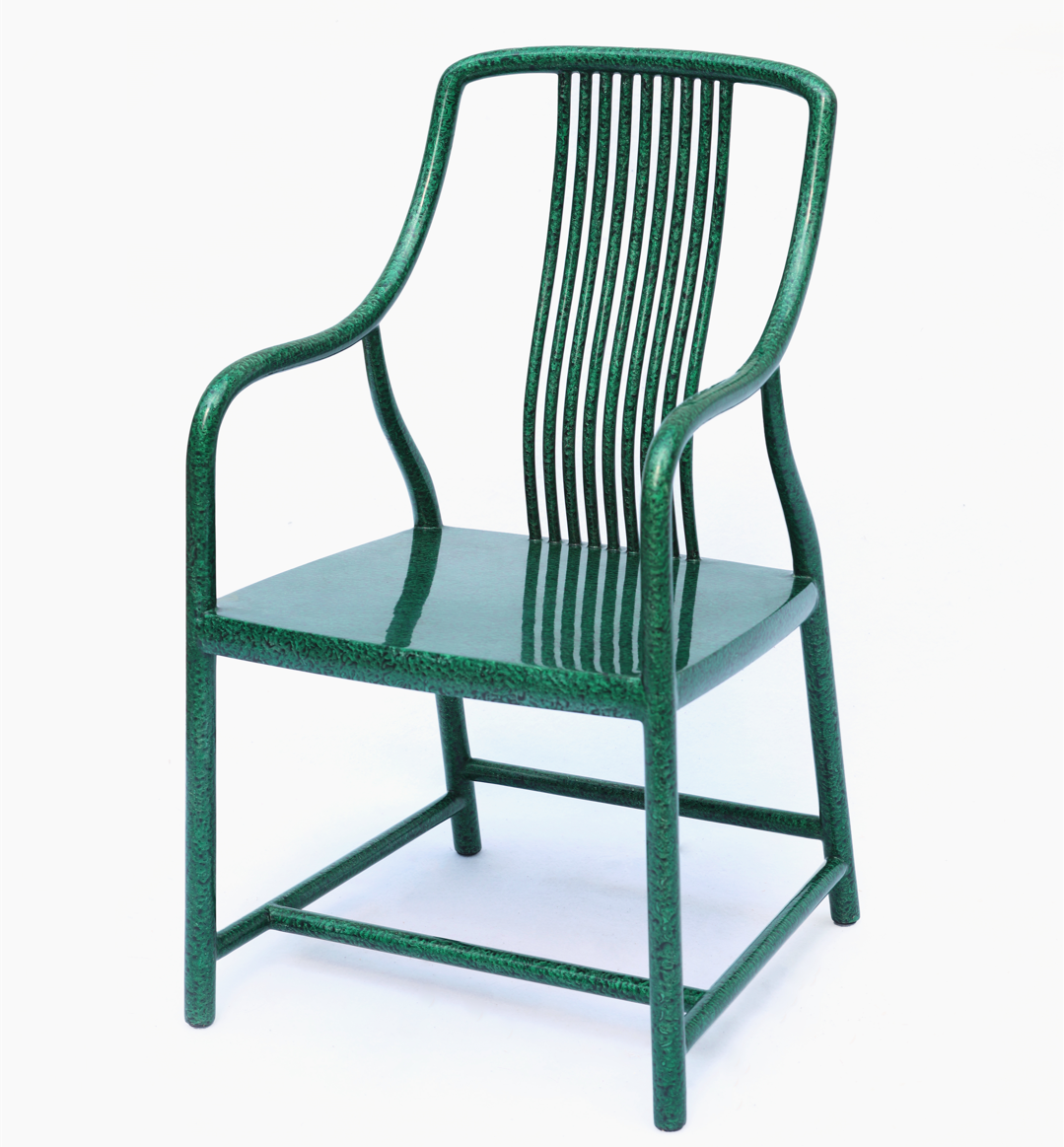 绿色配色如山水庭院,赋予静物动态意境。椅身线条简练承自明式家具,与古典漆艺形成时空对话。此椅兼具实用与艺术价值,既是非遗的当代转译,亦是东方雅致生活的体现,适用于中西多元空间。