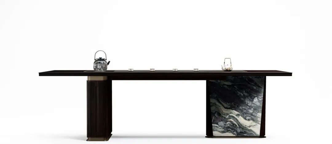灵感源自水墨画「墨分五色」的渐变层次。台面以传统榫卯结构与奢石侧板相接——木的温润与石的冷峻形成张力,奢石天然云纹恰似墨色晕染。边缘采用手工创削成型,保留如宣纸褶皱般的自然肌理,以极致工艺实现「重墨飞白」的视觉诗意。