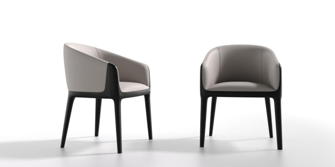 改良中式传统圈椅的造型,结合现代软包的云端坐感。一体弯折工艺形成自然倾角的靠背曲线。座面填充高密度海绵并包覆头层牛皮,表面木材纹理与皮革光泽相映。灵感来源于传统,却又超越传统,展现了设计与工艺上的精湛造诣。
