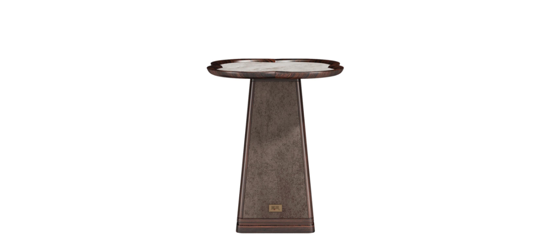 抽象化演绎山水画中的云纹意象。表面切割出云朵状凹凸纹路,底部实木基座主材选用黑胡桃,以穿插式结构托举台面。边缘采用「倒角导圆」工艺,木质部分经多次手工擦色呈现渐变效果,仿佛云雾环绕山峦,轻盈视觉中蕴含结构力量。